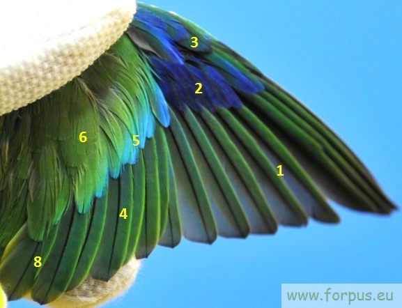 2014: 1 Handschwingen, 2 Handdecken, 3 Daumenfittich, 4 Armschwingen,
